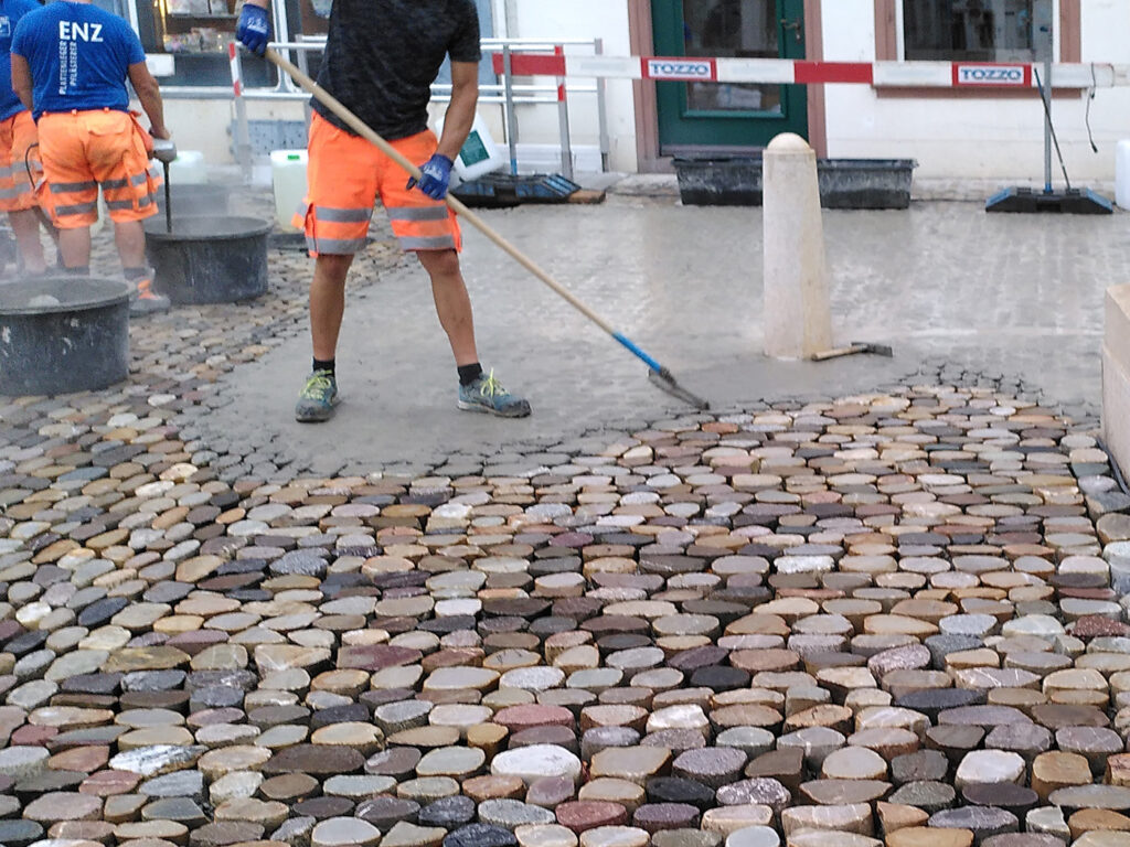 Der Argumentation folgend wäre darauf zu achten, dass möglichst viele Flächen mit Kopfstein in Sand gelegt wird. Vor Ort präsentiert sich leider ein anderes Bild: Grosse Lasten der Spedition oder LKWs, Leitungen im Boden, Strassenreinigung sowie die Gefahr von Frostschäden ist das, was bei den Entscheiden zählt. Bei Reparatruren von Leitungen im Boden muss damit leider mit schweren Werkzeugen gearbeitet werden. Das erzeugt Lärm und Bauschutt, wie wir es vom Aufbrechen von Asphalt kennen.