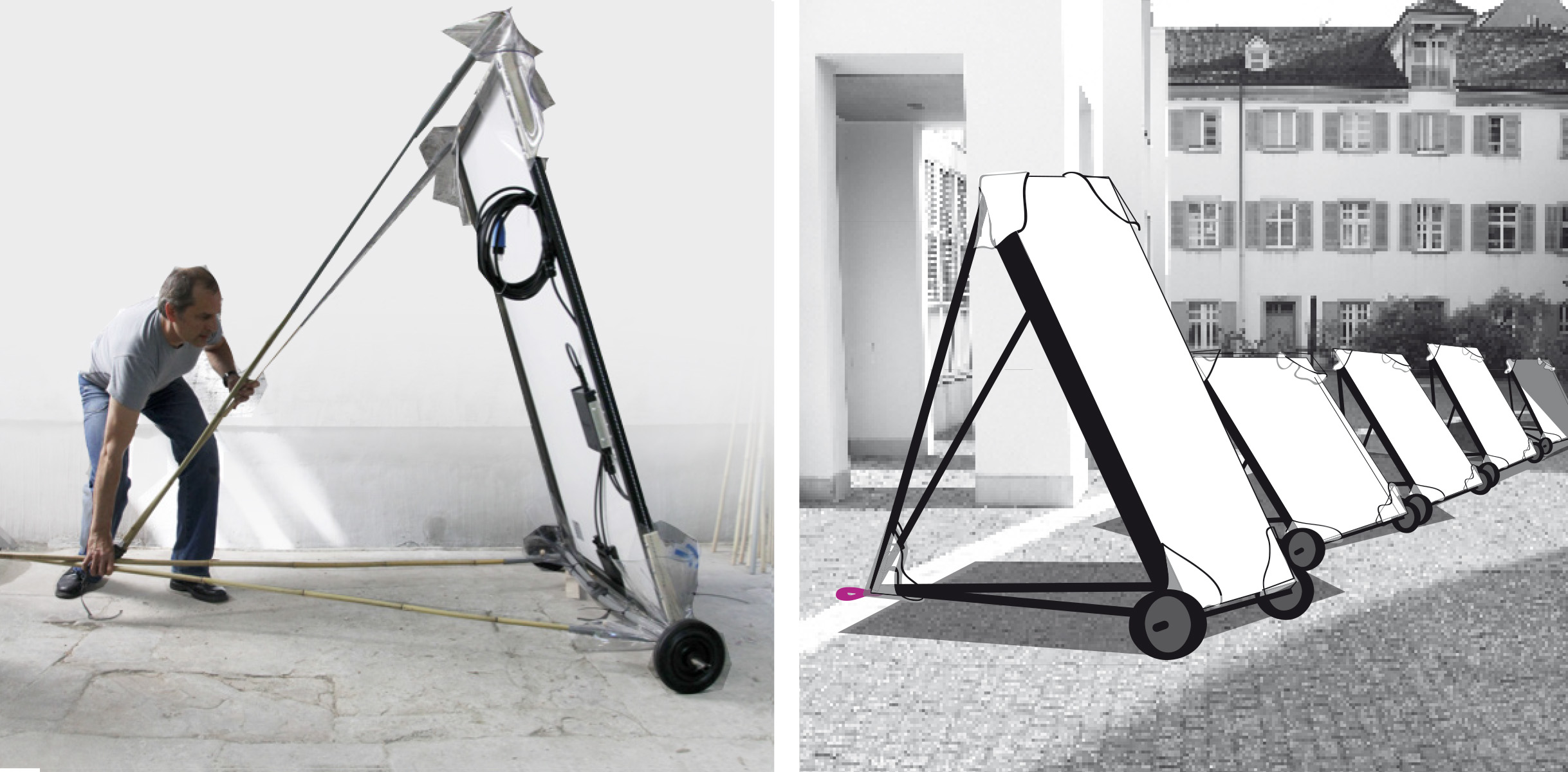 Solar Panels are heavy and not very ergonomic and seems not to be realy useful for termporary use. This can be done with a SOLAR PANEL MOBILE. The kit allows a simple construction in the open air, has the strength for 1-2 floors and with proper bracing can become any height. Optionally, a BALDACHIN can be added for the use of the SOLAR PANEL MOBILE.